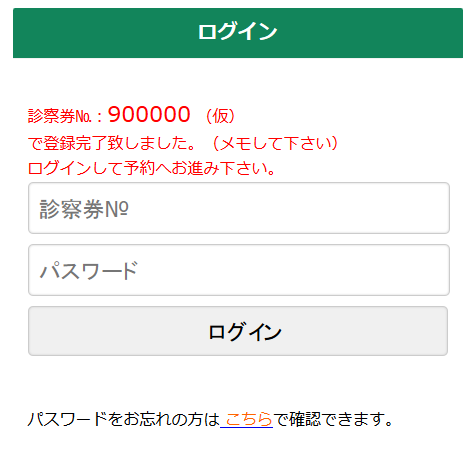 表示された会員№(仮)と、2.で登録したパスワードを入力して、[ログイン]をクリック